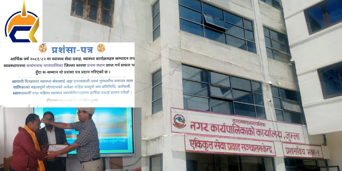 आर्थिक वर्ष ०८१÷८२ मा स्वास्थ्य सेवा प्रवाह, कार्यसम्पादन र व्यवस्थापनमा चन्दननाथ नगरपालिका जुम्ला जिल्लाकै प्रथम स्थान हासिल गरेको जनस्वास्थ्य सेवा कार्यालय जुम्लाका प्रमुख कृष्ण सापकोटाले बताए । उनलेभने ८३ अंक प्राप्त गरी प्रथम भएको चन्दननाथ नगरपालिका स्वास्थ्य शाखा प्रमुख क्षेत्र महतलाई प्रशंसा पत्र प्रदान गरिएको हो ।
